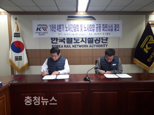 한국철도시설공단 영남본부(본부장 석호영)는 상호신뢰를 바탕으로 하는 협력적 노사관계를 공고히 함으로써 사회적 가치를 실현하고 근로조건을 향상시키기 위해 28일 ‘노사화합 공동 파트너십’을 선언했다고 밝혔다.