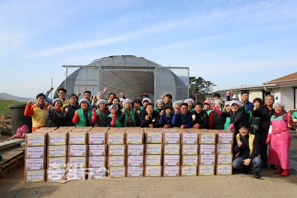 한국서부발전 직원들을 비롯한 태안군 지역주민들이 함께 김장 나눔 봉사활동을 전개하고 기념촬영한 모습(앞줄 가운데가 태안군 가세로 군수)