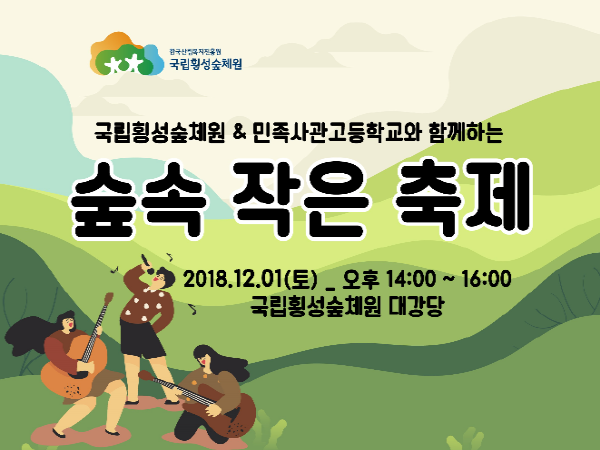 산림청 한국산림복지진흥원(원장 윤영균)은 내달 1일 강원 횡성군 둔내면 국립횡성숲체원 대강당에서 민족사관고등학교(교장 최관영) 동아리 학생등로 구성된 ‘숲속 작은 축제’를 개최한다고 29일 밝혔다.
