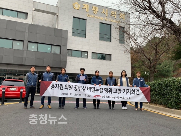 노조는 29일 오후 계룡시의회 앞에서 기자회견을 열고 "윤차원 의원은 지난 9월부터 집행부를 상대로 불법, 부당 행위를 하였음에도 불구하고 마치 공무원 노조가 시의원의 정당한 의정 활동을 방해하고 있는 것인양 거짓말을 일삼고 있어 집행부와의 신뢰관계를 심각하게 훼손했다"고 말했다.