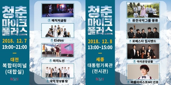대전문화재단은 다가오는 7일과 8일 대전복합터미널과 세종대통령기록관에서 ‘<청춘마이크> 송년플러스’ 추가공연을 진행한다.