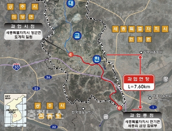 세종특별자치시(시장 이춘희) 연기면 세종리 금강 합류부에서 장군면 도계리 일원 7.6㎞ 구간의 홍수범람 및 침수피해 등을 예방하기 위한 ‘대교천 재해예방사업’이 내년 상반기 본격 추진된다.