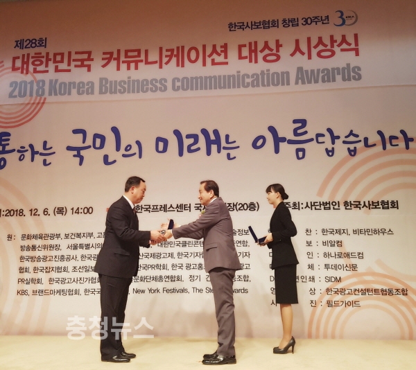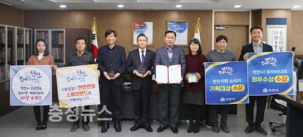 지난 6일 사단법인 한국사보협회 주최로 서울 한국프레스센터에서 열린 ‘2018 대한민국 커뮤니케이션 대상’ 시상식에서 천안시 시정 소식지 ‘천안사랑’이 인쇄사보 공공부문 기획 대상을 받고, 홍보 뮤직비디오 ‘헤븐시티(Heaven City)’가 홍보영상물 부문 최우수상을 받았다.