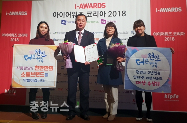 충남 천안시는 지난 6일 오후 서울 롯데호텔에서 열린 (사)한국인터넷전문가협회와 웹어워드코리아가 공동 주최하고 과학기술정보통신부가 후원하는 인터넷에코어워드 2018 시상식에서 ‘지방행정 분야 대상’을 수상했다.