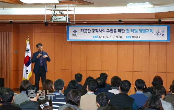 대전 유성구(구청장 정용래)는 7일 구청 대회의실에서 전 직원을 대상으로 깨끗한 공직사회 구현을 위한 전 직원 청렴교육을 실시했다.