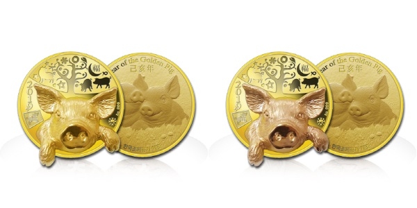‘2019 기해년 입체형 황금 돼지 기념 금메달’은 메달 부분은 금 순도 99.9%, 중량 22.5g이며, 입체형 황금돼지 부분은 금 순도 75%, 중량 8.2g으로 핑크 골드와 옐로우 골드 2종으로 선보인다. 핑크 골드 500개, 옐로우 골드 500개 등 총 1000개 한정 판매된다.