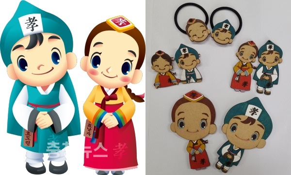 (좌) 효낭자, 효도령, (우) 캐릭터 활용 물품들