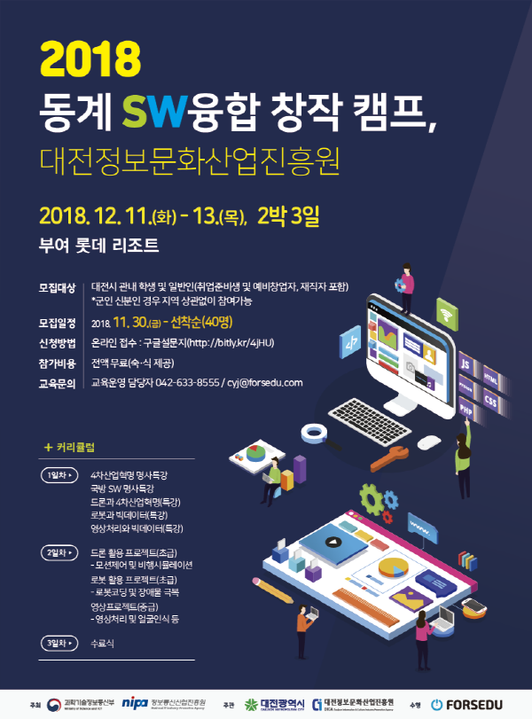 대전시는 대전정보문화산업진흥원(원장 박찬종)과 함께 11일부터 사흘간 부여 롯데리조트에서‘2018 동계 SW융합 창작캠프’를 개최한다고 밝혔다.