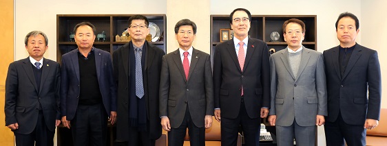 왼쪽부터 양덕주 사무처장, 정균철 유정TMR영농조합 대표이사, 이종서 총장, 고규환 아세아지주회사 대표이사, 우창섭 ㈜우창물산 대표이사, 강호계 잉글리쉬앤(주) 대전본부장.