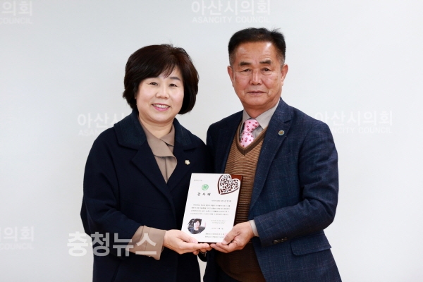 아산시의회 김영애 의장이 12일, 충청남도4-H본부(회장 유근종)로부터 농업·농촌의 가치를 높인 공로로 감사패를 받았다.