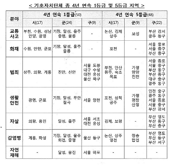 또한 충남 공주시도 생활안전분야에서 4년 연속 5등급을 기록해  낮은 수준을 보였다.