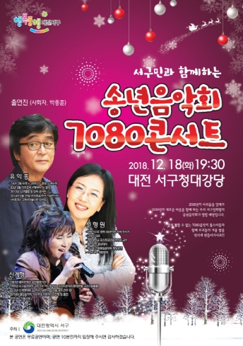 대전 서구(구청장 장종태)는 18일 서구청 대강당에서 2018 송년음악회 ‘신계행, 유익종, 신형원과 함께하는 7080 콘서트’를 개최한다고 밝혔다.