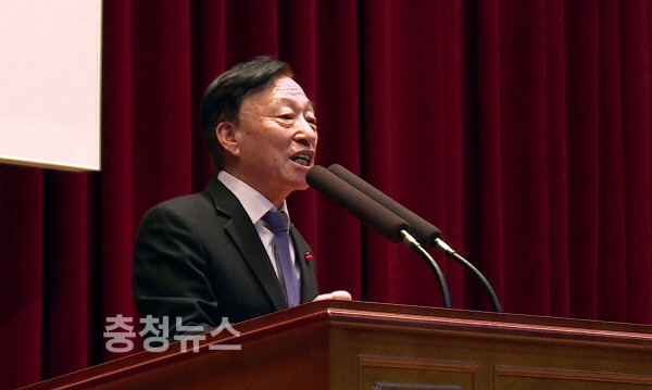 글로벌 현장학습 성과보고회에서 인사말을 하고 있는 설동호 교육감