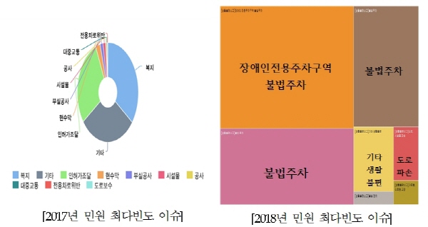 군에 따르면 2017년~2018년 새올민원접수현황을 활용한 행정안전부 빅데이터 플랫폼인 ‘혜안’ 시스템 테마분석과 표준분석을 통해 분석한 최다빈도 민원이슈는 17년에는 생활 수급, 기초 생활, 한부모가족 등의 복지 민원이 가장 많았지만 18년에는 불법주정차, 도로파손, 가로등·신호등 고장 등 도로교통 관련 민원이 가장 많았던 것으로 나타났다.
