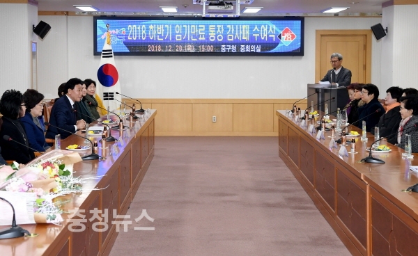 대전 중구(구청장 박용갑)는 20일 청사 중회의실에서 2회 연임으로 임기가 만료되어 퇴임을 앞둔 통장 18명에게 감사패를 수여했다.