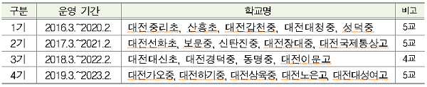 대전시교육청은 2016년 창의인재씨앗학교 5 개교(초 2, 중 3)를 시작으로, 2017년 5개 교, 2018년 4개 교, 2019년에는 5개 교를 추가로 지정해 내년에는 총 19개 교(초 4, 중 11, 고 4)를 운영할 예정이다.