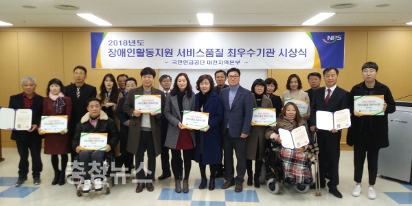 국민연금공단 대전지역본부(본부장 김종진)는 지난 20일 대전지역본부 회의실에서 2018년도 장애인 활동지원기관에 대한 평가에서 ‘장애인활동지원 서비스품질 최우수 기관’으로 선정된 관내 7개소를 대상으로 시상식을 개최했다고 밝혔다.