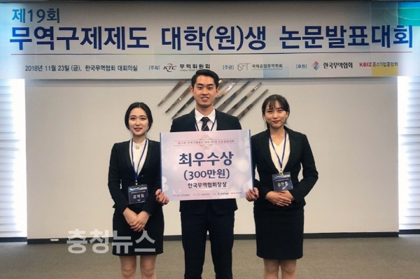 이에 앞서 정원종, 김채림, 김한별 학생은 지난 11월 23일, 한국무역협회 대회의실에서 열린 ‘2018 무역구제제도 대학(원)생 논문발표대회’에서 ‘반덤핑 제소가 한국 수출에 미치는 경제적 효과에 관한 연구’로 최우수상인 한국무역협회장상을 수상했다.