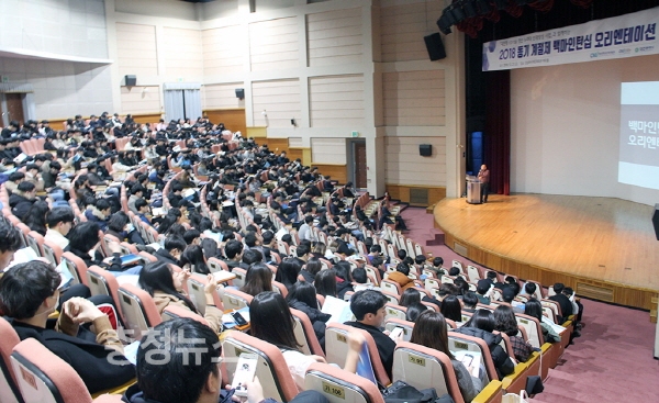 충남대 인재개발원은 12월초에 진행된 사전교육과 지난 21일, ‘동기계절제 백마인턴십(현장실습) 오리엔테이션’을 개최했다, 이날 오리엔테이션에 참석한 약 400명의 충남대 재학생들은 24일부터 4주, 8주간 대전지역의 연구소, 중견기업, 강소기업, 스타트업 등 100여개 기업에서 인턴십을 수행한다.