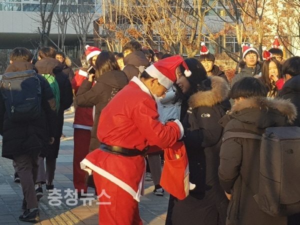 크리스마스를 하루 앞둔 24일, 케롤송이 울려퍼지는 세종시 한 중학교 아침 등굣길에 산타가 나타났다.