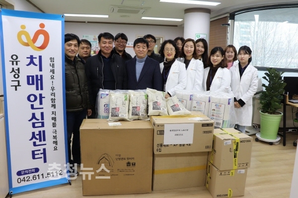 지난 11일 신현정 유성구보건소장(앞줄 왼쪽에서 세 번째)이 구 보건소에서 통계청 노동조합으로부터 치매가족을 위한 후원물품을 기탁 받고 기념촬영