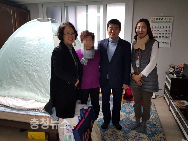 24일 신현정 유성구보건소장(오른쪽에서 두 번째)이 치매안심센터 직원들과 함께 치매사례관리 대상 가구를 방문해 통계청 노동조합으로부터 후원받은 물품을 전달