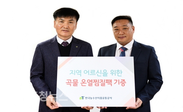 한국농수산식품유통공사(aT, 사장 이병호) 백진석 부사장은 지난 21일aT 임직원이 직접 제작한 온열찜질팩 100여개를 인근 요양병원 어르신들에게 전달하며 연말연시 이웃과 따듯한 정을 나눴다.