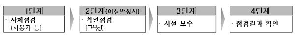 이번 점검은 총 4단계로 진행 할 예정이며, 자체 점검(관리주체) 후 이상 발견 시 교육청에서 확인점검반을 구성하여 점검 및 보수를 관리·감독 할 계획이다.