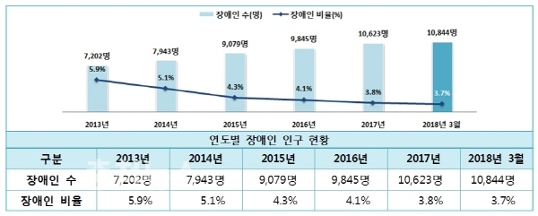 우선 세종시 내 장애인 인구는 지난 2013년 7,202명 이후 꾸준히 증가해 2018년 3월 말 기준 1만 844명을 기록, 세종시 전체 인구의 3.7%를 차지했다.