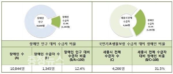 국민기초생활보장 장애인 수급자는 총 1,345명으로 장애인 전체 인구 대비 12.4%를 차지했고, 세종시 국민기초생활보장 수급자(4,266명) 대비 31.5%에 이르는 것으로 조사됐다.