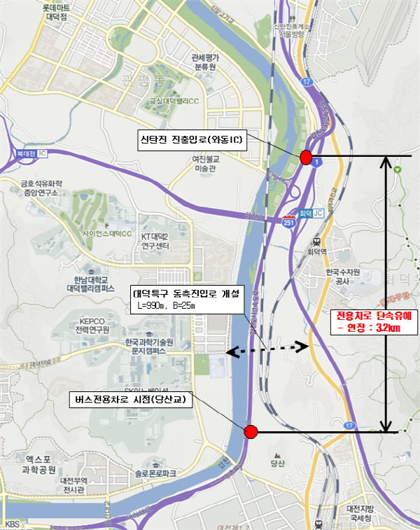 해당구간은 2016년 7월 20일부터 운행하기 시작한 대전~오송 BRT구간으로 중앙버스전용차로 운영에 따라 1개의 일반차로가 축소돼 출퇴근 시 정체가 상습적으로 발생하고 있는 구간이다.