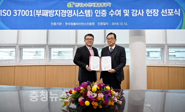 한국농수산식품유통공사(aT, 사장 이병호)는 26일 한국컴플라이언스인증원(원장 이원기)으로부터 부패방지경영시스템 국제표준인 ISO 37001 인증을 취득했다고 밝혔다.