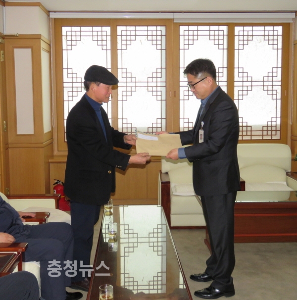 월평공원 토지주들은 26일 대전시청을 방문, 장기미집행 도시·군계획시설결정 해제 입안 신청서를 임재진 비서실장에게 제출했다. 사실상 대전시를 압박하는 것.