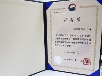 대전 중구(구청장 박용갑)가 2018년 주민등록과 인감 업무 운영부분에서의 공로를 인정받아 행정안전부로부터 장관상 표창을 받았다고 27일 밝혔다.