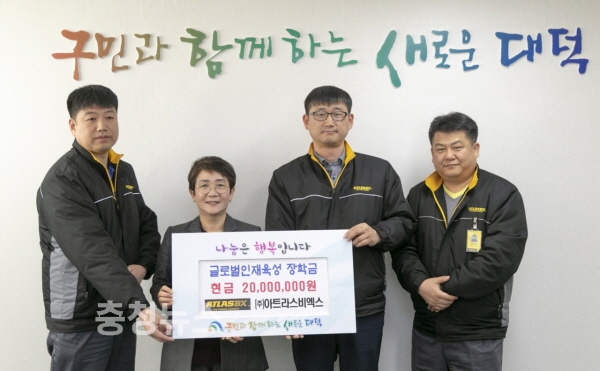 아트라스비엑스는 지난 2012년부터 올해까지 지역의 저소득 학생들에게 학습비를 지원하는 대덕구 글로벌인재육성사업에 1억 2천 여만원의 성금을 기탁하며 지역 인재 성장과 발전을 후원하고 있다.