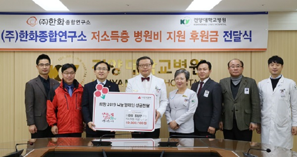 건양대병원은 27일 ㈜한화종합연구소로부터 저소득층 환자들의 의료비에 써달라는 성금을 전달받았다.