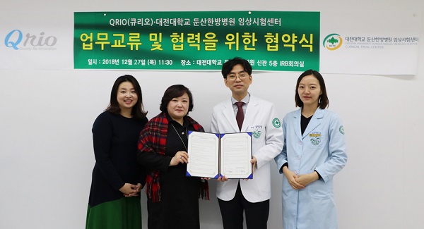 대전대 둔산한방병원 임상시험센터(센터장 박양춘)와 큐리오(대표 민규리)는 27일 둔산한방병원 임상시험센터에서 업무 교류 및 협력을 위해 협약(MOU)을 체결했다.