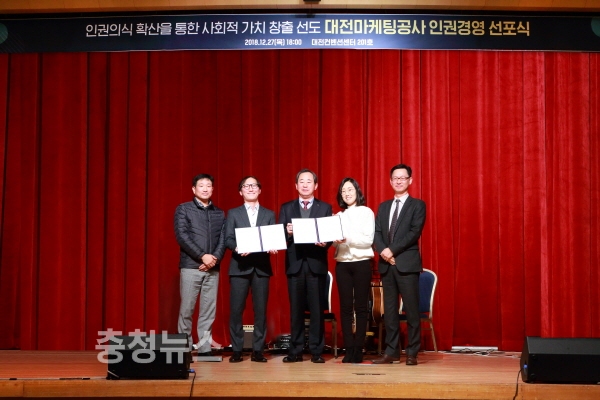 대전마케팅공사(사장 최철규)는 지난 27일, 대전마케팅공사 임직원, 사외이사 및 유관기관 관계자가 참석한 가운데 인권경영 실천을 위한 ‘인권경영 선포식’을 가졌다고 밝혔다.