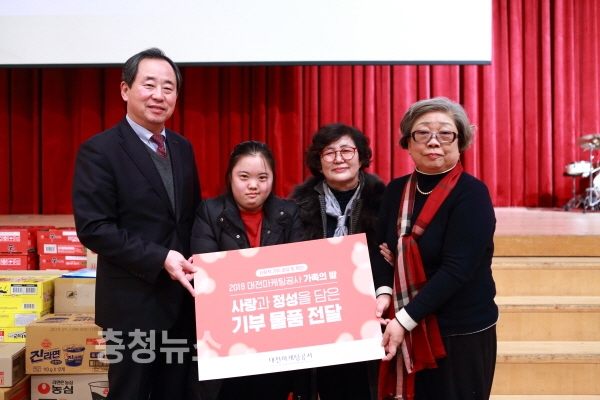 또한 대전마케팅공사는 이날 인권경영선포식과 함께, 공사 임직원 모두가 십시일반 기부한 방한용품, 쌀, 라면, 화장지 등 생필품을 사회복지시설인 성우보육원과 예솜동산에 전달하였다.