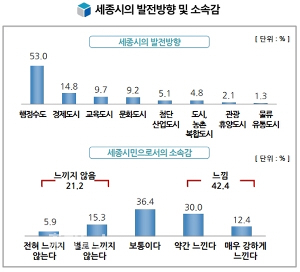 세종시민으로서의 소속감을 묻는 질문에는 ‘약간 느낀다’가 30%, ‘매우 강하게 느낀다’가 12.4%로, 긍정 응답(42.4%)이 부정 응답(21.2%)을 압도했다.