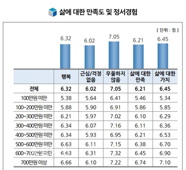 이어 올해 세종시민의 ‘삶에 대한 만족’은 6.21점, ‘삶에 대한 가치’는 6.45점, ‘행복’ 경험은 6.32점으로 나타났다.