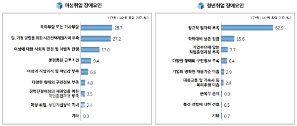 청년취업 장애요인은 ‘정규직 일자리부족’이 62.9%로 가장 높게 나타났고, ‘학력대비 낮은 임금’이 15.6%로 집계됐다. 여성취업 장애요인은 ‘육아부담 또는 가사부담’이 28.7%로 가장 높았고, ‘시간선택제 일자리 부족’이 27.2%로 조사됐다.