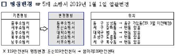 30일 대전시 소방본부에 따르면 2019년 1월 1일부터 중부소방서가 동부소방서로, 서부소방서가 둔산소방서로 명칭이 변경된다. 또 동부소방서는 대덕소방서로, 북부소방서는 유성소방서로, 남부소방서는 서부소방서로 각각 이름이 바뀐다.