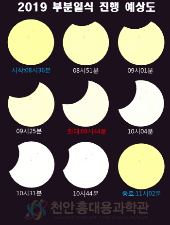 천안 기준으로 이날 오전 8시 36분경부터 달이 태양을 조금씩 가리기 시작해 9시 45분경 최대 23%의 면적이 달에 가려지며, 이후 달은 다시 태양 밖으로 빠져나와 오전 11시 2분경 부분일식이 완전히 종료될 예정이다.