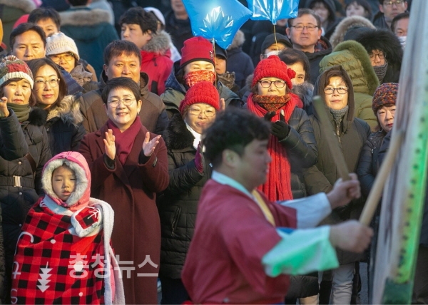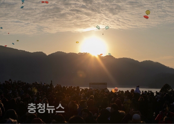 새해 첫날 오전 8시 15분 경 산등성이 너머 하늘에 조금씩 붉은 빛이 번지며 기해년 첫 태양이 서서히 모습을 보이자 가족, 친구, 연인과 함께 대청호를 찾은 해맞이 관람객들은 일제히 탄성을 지르며 새해 소망을 빌고 덕담을 나눴다.