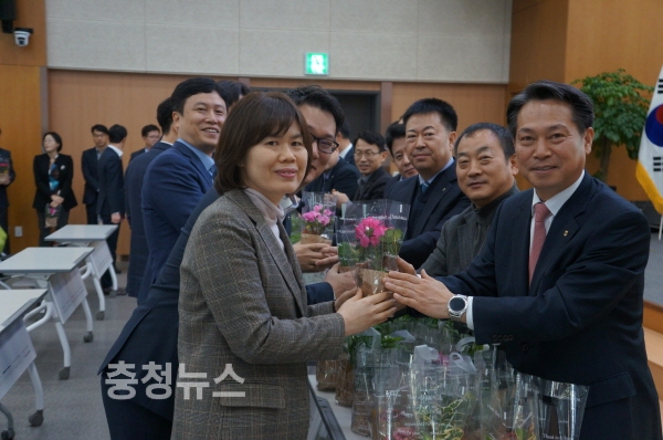 직원들과의 신년 인사나눔 시간에는 경영협의회 간부들과 함께 충남본부 직원들에게 꽃화분 나눠