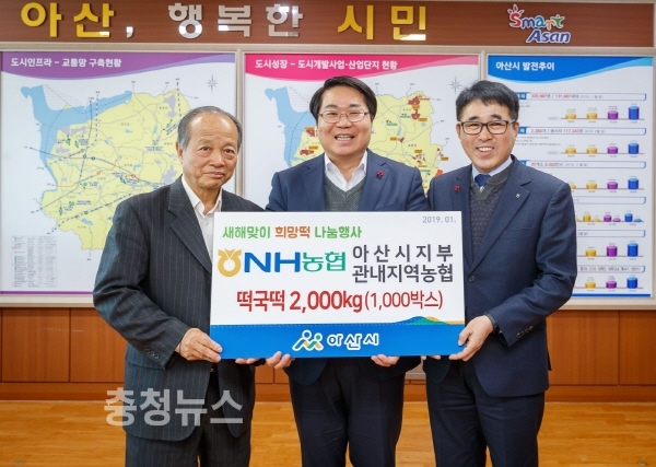 NH농협 아산시지부(지부장 임성동)와 관내 지역농협은 3일 아산시(시장 오세현)에 후원물품으로 떡국떡을 전달했다.