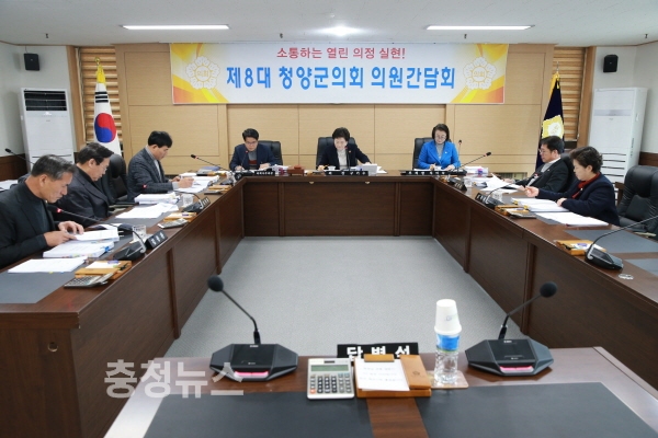 청양군의회(의장 구기수) 기해년 첫 의원간담회가 4일 특별위원회 회의실에서 열렸다. 이번 간담회는 제251회 임시회를 대비하여 집행부 안건 청취 등으로 진행되었다.