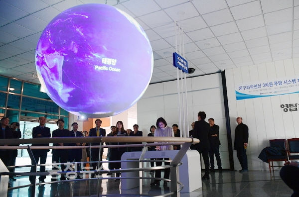 ‘지구과학현상 3차원 투영시스템’은 지구를 포함한 행성의 대기, 해양, 지질 및 천문우주 현상을 구(球)위에 3차원 영상으로 표출하는 최첨단 가시화 시스템이다.