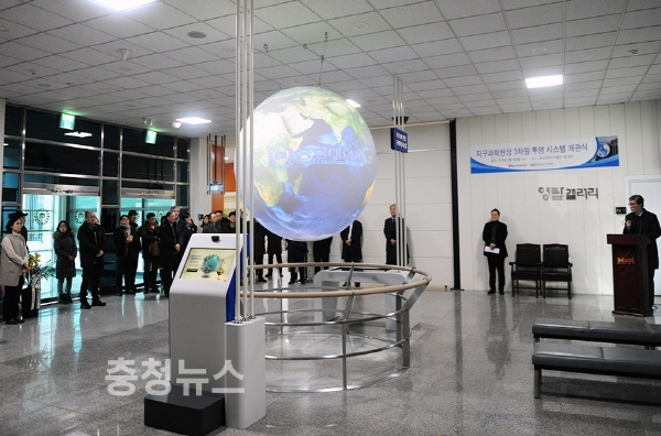 충남대학교에 지구 및 천문우주 현상을 3차원 영상으로 보여주는 구체 투영시스템이 설치돼 일반에 공개됐다.